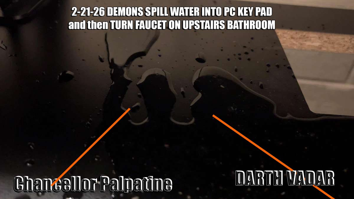 On February 21st, 2026, at 6:00 am, the demon Vepar and two other demons spilled bottled water into my keypad. An hour later, at 7:07 am, I came upstairs, and the demon Vepar and other water demons had turned on the upstairs bathroom faucet. They did the same with the tub around three months ago. I verified the identities of the water demons at 7:18 am on the 21st.